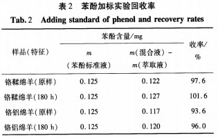 加标实验过程中选取2种样品进行回收率测定。从已知试验样品浓度的萃取液中取出0.5 mL,再加入0.5 mL的苯酚标准液,进行回收率的测定,其回收率结果见表2。