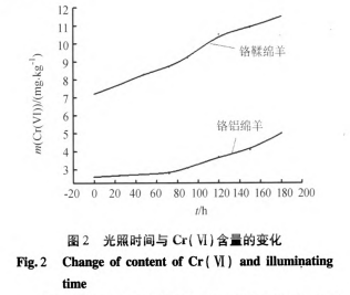 Cr(Ⅵ)的毒性报道较多,用Cr(III)制造皮革或毛革可以使其中Cr(Ⅵ)含量达到REACH法规的限量要求(3 mr/kg)标准。但是,当毛革经过光、热、湿和pH(碱性)后情况会发生变化,导致产品毒性增加[12l。Cr(VI)在酸性条件下与二苯卡巴肼的络合显色反应于540 nm处进行吸光度测定,不同用量铬标液对应吸光度大小不同,制备工作曲线。样品经不同光照时间处理,取样萃取,然后进行cr(Ⅵ)含量测定。测量方法同铬(VI)工作曲线绘制时的操作一致,其不同光照时间样品对应的含量如图2所示。