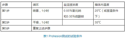 Prohesion测试是循环盐雾试验的一种,二十世纪六十年代和七十年代,英国的Harrison和Timmons开发了Prohesion测试[2,3],特别适用于工业防护涂料的腐蚀性测试。具体的试验条件如表1所示: