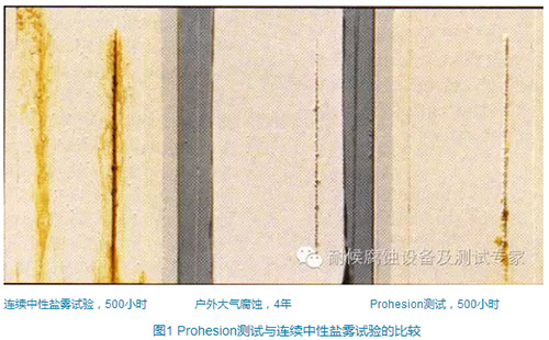 与连续中性盐雾试验相比,Prohesion测试与户外大气腐蚀的相关性好一些。以下图1是一种涂料在连续中性盐雾试验、户外大气腐蚀和Prohesion测试条件下的结果[2]。从图1中明显看出,Prohesion测试与户外大气腐蚀的相关性比连续中性盐雾试验与户外大气腐蚀的相关性好。