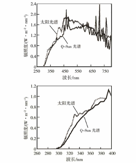 在执行标准时,应使用日光过滤片来过滤氙灯光源,实现该标准对光源的要求。日光过滤片是用来模拟户外直射太阳光常用的氙灯过滤系统,经日光过滤片过滤的氙灯光源,接近实际的户外光照环境,其光谱与太阳光光谱之间的比较如图1所示。因为780nm或800nm以上的红外光谱对于高分子材料的作用仅为热效应,在有黑板温度控制的条件下,红外光谱往往不被考虑。因此,新的光谱曲线一般仅描述紫外和可见光部分。