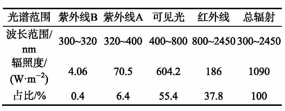 该标准的4.3节指出光谱能量分布参照CIE 85,具体见表1。波长从280~3000nm总的辐照度为1120W/m2。