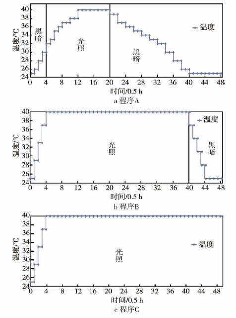 程序A的一个循环是24h,包括8h光照和16h黑暗,重复进行。程序B的一个循环也是24h,包括20h光照和4h黑暗,重复进行。程序C是持续光照。每个程序的光照时间,黑暗时间,温度要求如图2所示。