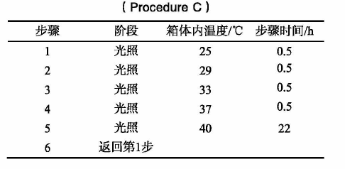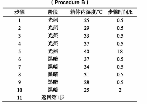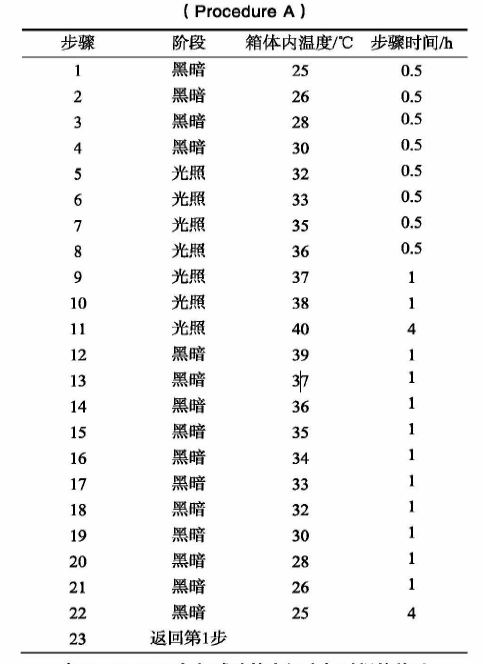 上述5.2节和7.1节中对温度上升或下降速率的描述,与图2中温度与时间的描述不符。如果按照5.2节和7.1节的要求,则在光照阶段直接设置为40°C,在黑暗阶段直接设置为25°C即可。