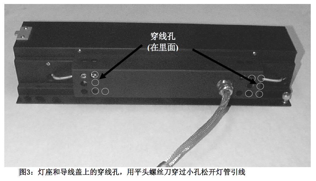 2.打开灯箱门,取下需要更换灯管的灯座。抓住电线上端的银色插头,把插头从镇流器上拔出,以断开灯的电源。(图2),灯座是用螺丝固定的,逆时针松开螺丝。如果太紧,则用螺丝刀。提起灯座,取下并放在桌上。用平头螺丝刀穿过导线盖上的小孔,从接线端上拆下灯管引线(图3)。