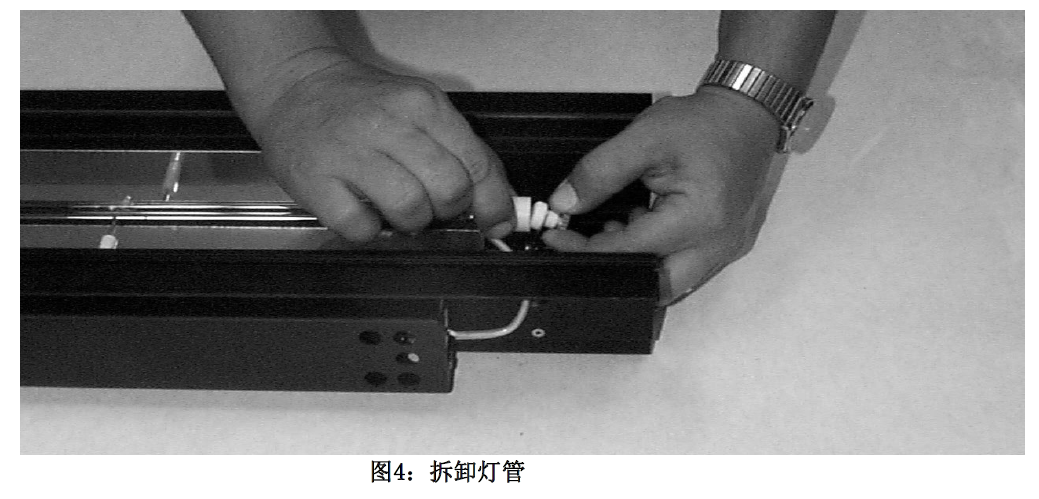 3.拆卸灯管时,轻轻抓住并拉开图4中的圆钮,灯管就可以从另一端的固定钮脱出。丢弃灯管时要小心不要打碎玻璃,先剪断引线。