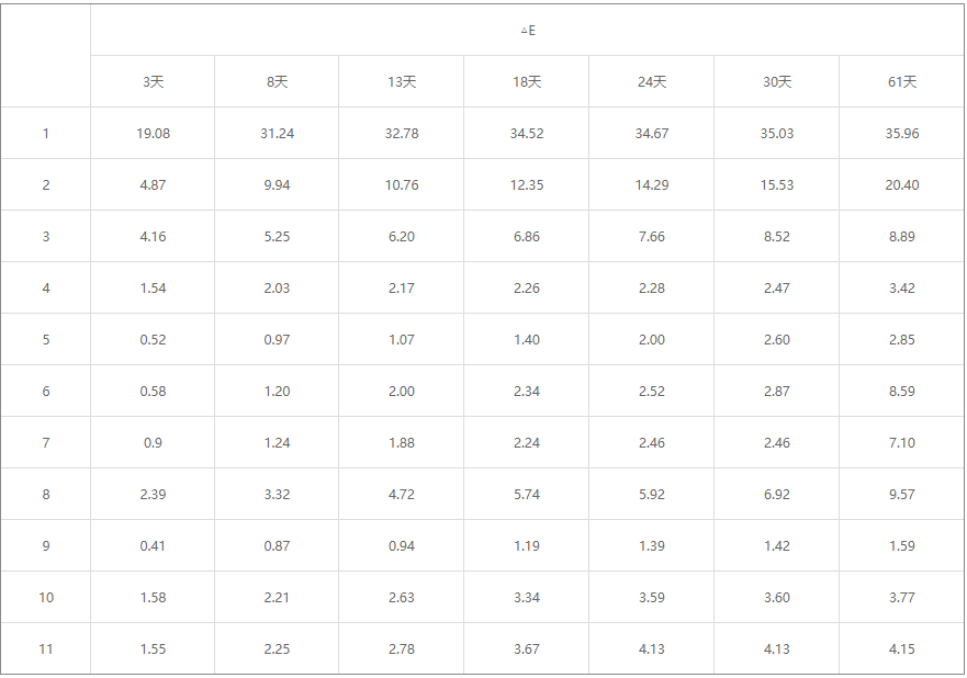 在进行氙灯加速耐光性试验的同时,我们还对这些油墨样品进行了自然曝晒试验。将11种油墨样品放置在靠近工厂仓库的窗玻璃旁,用以模拟油墨样品在实际应用中遇到的较为严酷的环境。将这些油墨样品曝晒61天后,使用仪器测量法测得油墨样品试验前后的色差△E*,试验结果见表3。
