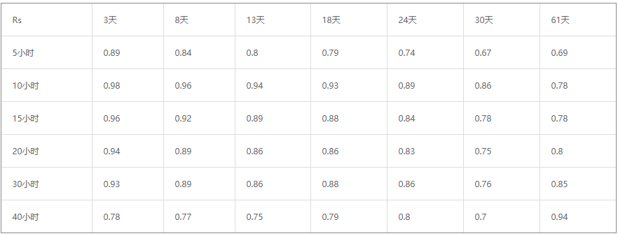 从表4可以看出,氙灯加速耐光性试验与自然曝晒试验所有试验阶段的相关系数多大于0.70,相关性非常好。其中,氙灯加速耐光性试验10小时与自然曝晒试验3天之间的相关系数高达0.98。