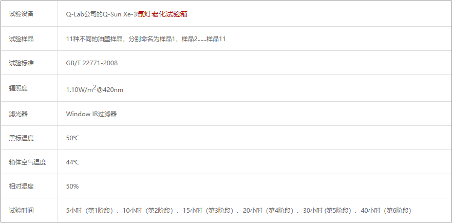按照GB/T22771-2008标准中的试验条件,对11种不同的油墨样品进行氙灯加速耐光性试验。具体试验条件见表1。