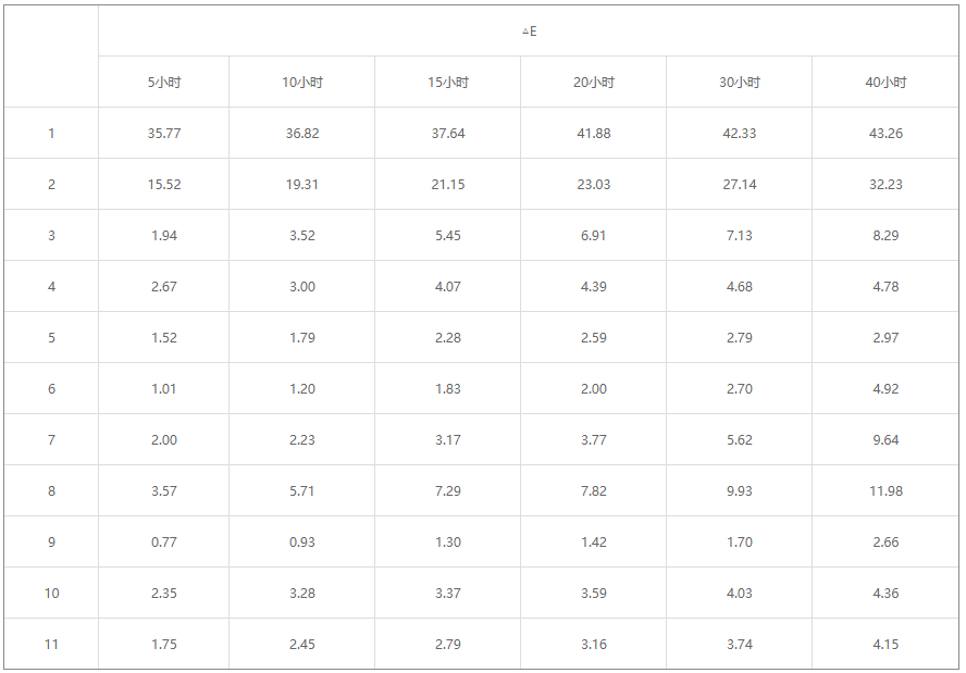 从表2和表3的试验结果可以看出,油墨样品自然曝晒试验61天的色差值并没有氙灯加速耐光性试验40小时的色差值大。我们以自然曝晒试验61天时油墨样品的色差值为基准,分别换算氙灯加速耐光性试验中每种油墨样品达到同样色差值时的时间,再取其算术平均值,后得出:氙灯加速耐光性试验29小时相当于自然曝晒试验61天的效果,也就是说氙灯加速耐光性试验的速率是自然曝晒试验速率的50倍。当然,这个倍数只是针对本文研究的11种油墨样品而言,对于其他油墨样品或者其他包装材料未必适用。