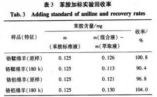 同时,对苯胺进行加标实验,同苯酚加标实验方法一致,亦取0.5 mL已知浓度萃取液和0.5 ml苯胺标准液于10 mL比色管,进行加标回收率的测定。其回收率如表3所示。