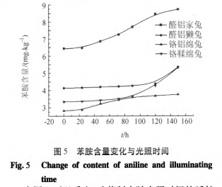 毛革的加工过程中,毛发的染色是一重要工序,毛革较常用染料有酸性染料、酸性络合染料以及中性染料染色,而其中的色调更为错综复杂。各国条款已明文规定禁用偶氮染料,然而这些常规酸性染料受光、热、湿和碱性pH的共同作用时是否会发生氧化、降解等其他反应,产生一些苯胺类的单体,对消费者的健康造成伤害我们不得而知。实验通过紫外分光光计来定量测量毛革制品不同光照时间下的苯胺含量变化,其中标准苯胺试剂用于工作曲线的绘制,不同光照时间下,苯胺含量的变化不同,其对应的变化如图5所示。