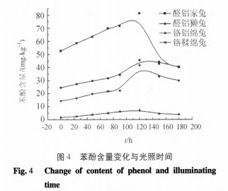 毛革制品经不同光照时间处理,其对应苯酚含量变化如图4所示。可以看出,毛革制品苯酚含量随着光照时间增加呈现先增加后降低的趋势。文献报道苯酚受紫外和可见光的光催化作用,可降低酚含量,致使后期光照时间增加苯酚含量降低。其中苯酚受光催化或其它自由基引发,产生苯氧自由基,继而形成苯醌与其他物质完成加成而消失。这种彼此消长的过程随老化时间延长产生转变。终导致苯酚含量降低。16|。毛革制品的苯酚含量随光照时间的增加呈现先增后降的趋势,造成其在前90h的光照时间内含量增加的原因可能是由于合成鞣剂以及含苯酚单体的其他助剂等材料受到光、热、湿和碱性pH的作用后,发生链断裂,释放有机单体,造成苯酚含量增加,而游离酚继续受光照、湿和碱性pH的影响,其可发生氧化、自由基聚合等反应,使苯酚含量趋于降低。