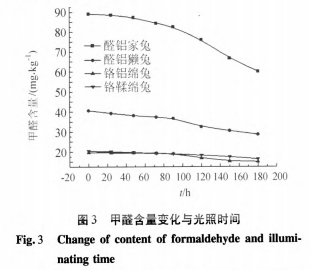毛革制品的进出口以及内销产品都要精确测量革内游离的甲醛量(mg/kg),借助甲醛和乙酰丙酮的特征性反应,于412 nm处进行吸光度测定。甲醛工作曲线的绘制参照标准GB/T 19941-2005。实验样品经不同光照时间照射,取样进行游离甲醛测定,不同光照时间,毛革制品中的游离甲醛量不同,其甲醛变化如图3所示。