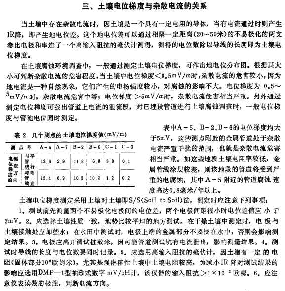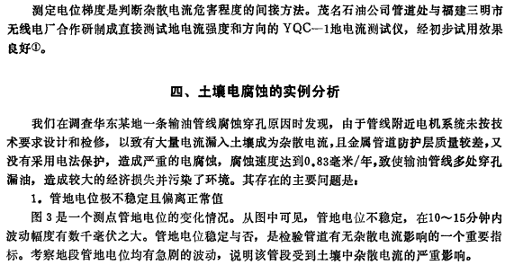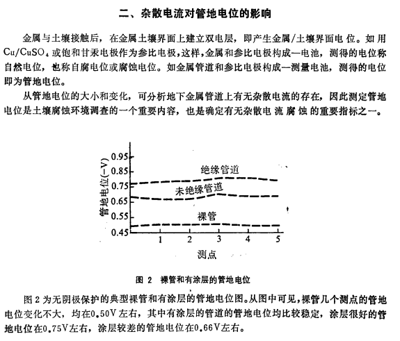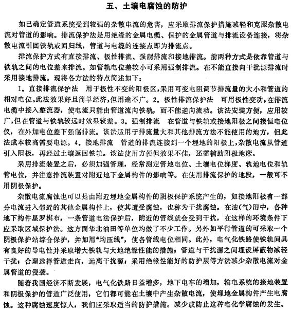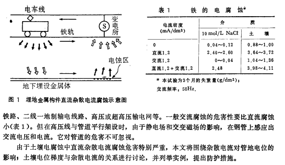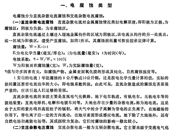 电腐蚀是杂散电流腐蚀 的简称。 杂散电流 是指非 固定通路上流动的电流它可直流杂散 电流 和交流 杂散电流。 这些 电流通过埋地 金属 构件产生 的腐蚀作用 称为 土壤杂散电流腐蚀或干扰腐蚀, 即土壤中的 电腐蚀。 例如在直 流 电气化铁路 附近 的地下管道、 储罐、 钢桩, 含水量较高的钢 筋混凝土构件都有可能遭受电腐蚀。 与直 流电气化铁路 平行铺设, 壁厚 7 ~ 8毫米的金属管道, 腐蚀严 重的数月就 发生穿孔。 由此 可见, 电腐蚀, 特别是直流 电流引起的腐蚀比没有杂散 电流的土壤腐蚀要严重 得多。土 壤中的 电腐蚀过程也是电化学溶解过程, 是因杂散 电流而 产生 的强迫 溶解, 而土 壤中自然腐蚀过程 是金属 与土 壤介质发生化学或电化学作用形成的 自然溶解过 程。 因此, 电腐蚀是 电化 学腐蚀 的一种特殊形式。