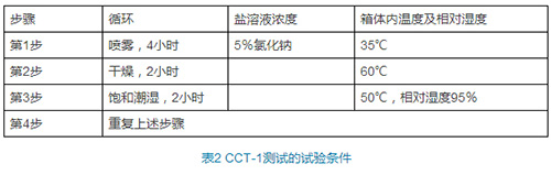 还有一些主要用于汽车腐蚀测试的循环盐雾试验,如CCT-1(CCT-A)。CCT-1测试同Prohesion测试一样,也是干湿交替循环。不过,具体的测试条件不同,如盐溶液及溶液浓度不一样,而且CCT-1测试还多了饱和潮湿循环。CCT-1测试具体的试验条件如表2所示: