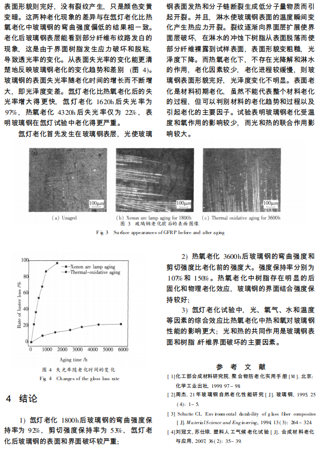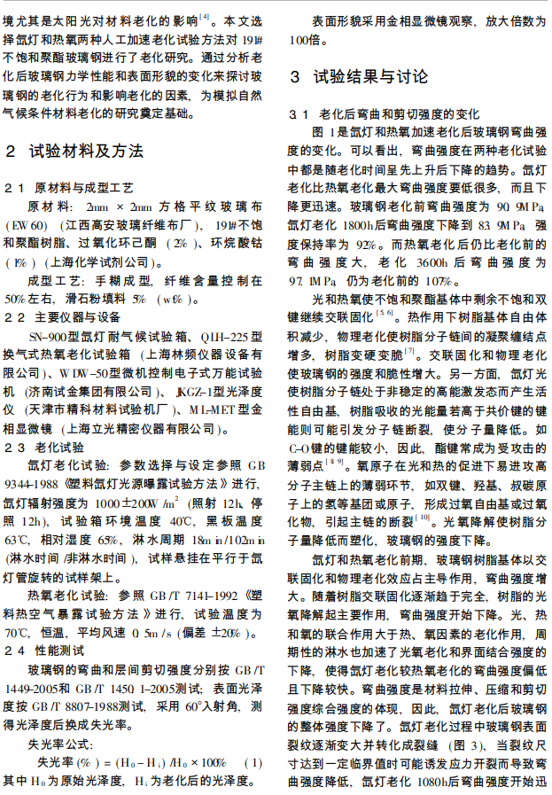 玻璃纤维增强不饱和聚酯复合材料 (简称玻璃钢 ) 具有比强度高、耐腐蚀性好、价格低廉和成型工艺简单等特点, 是一种应用非常广泛的高分子材料。但和其它高分子材料一样, 玻璃钢暴露于大气环境中受光、热氧和雨水的影响普遍存在老化的现象, 如机械强度下降、树脂颜色变黄、开裂、脱落以及界面脱粘等, 使得玻璃钢过早失效, 使用寿命变短。很多机构和学者对玻璃钢的老化规律进行了研究, 但大多是研究户外环境下材料的老化, 通常试验周期较长, 成本高, 而且重现性较差。人工加速老化可以大大缩短试验周期, 而且重现性也较好。氙灯气候老化试验箱能很好地模拟自然条件下大气环境尤其是太阳光对材料老化的影响。