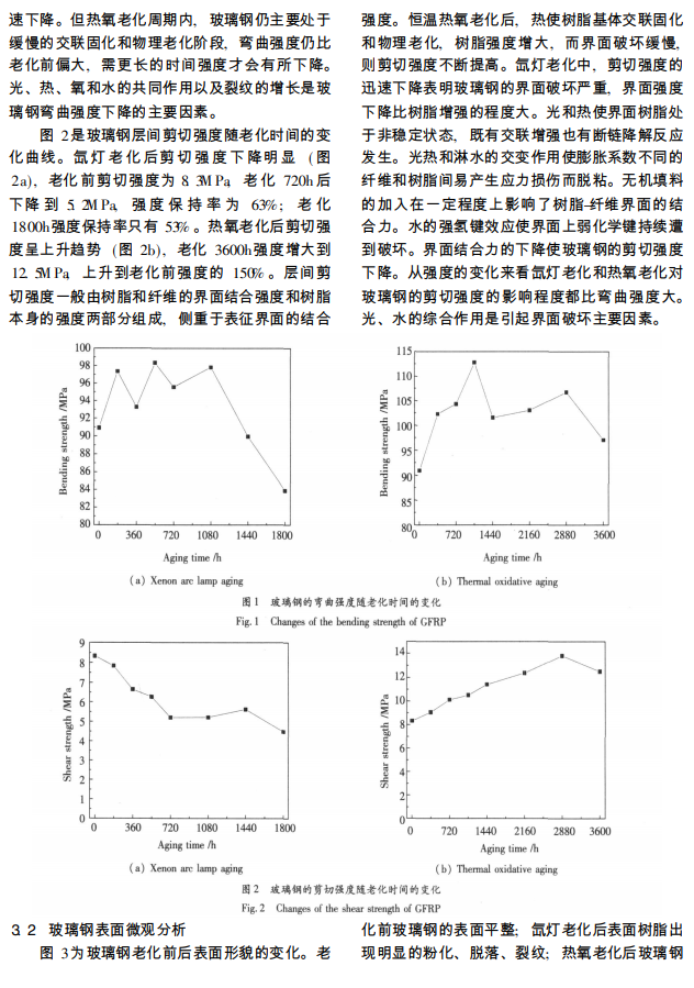 本文选择氙灯和热氧两种人工加速老化试验方法对 191#不饱和聚酯玻璃钢进行了老化研究。通过分析老化后玻璃钢力学性能和表面形貌的变化来探讨玻璃钢的老化行为和影响老化的因素, 为模拟自然气候条件材料老化的研究奠定基础。