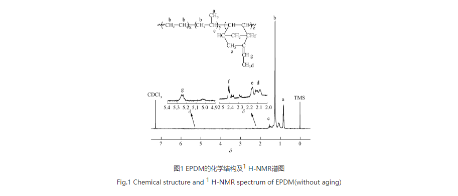 图1为EPDM的化学结构及1 H-NMR谱图,从图可见,EPDM由乙烯、丙烯和少量第3单体共聚而成。从化学结构分析,EPDM侧链上含有不饱和碳碳双键,其α-H易受光、热、氧等条件的影响而发生老化。此外,主链中叔碳上的碳氢键也易在紫外光的作用下断裂。图中,δ=0.02处为内标TMS的特征峰,δ=7.28处为溶剂CDCl3的特征峰,δ=0.85处为甲基的特征峰,δ=1.27处为亚甲基的特征峰,δ=1.56处为次甲基的特征峰,δ=5.25处为ENB单元中烯氢的特征峰,δ=2.13~2.05、2.15和2.40处分别归属为ENB单元中Hd、He和Hf的特征峰[9]。