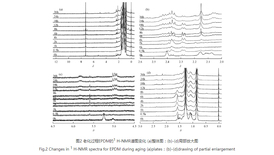 图2 (a)为紫外光老化过程1 H-NMR谱图的整体变化情况图,图2(b)~(d)为图2(a)的局部放大图。从图2(b)中可见,EDPM在紫外光下老化1h后δ在2.13~2.05、2.15和2.40处的特征峰基本消失,说明碳碳双键的α-H已经发生反应,紫外光对第3单体的影响较明显。老化0.5h后δ=2.37处的特征峰增强,这说明EPDM发生氧化,生成了羰基产物[10]。老化4h后在δ=2.15处出现了新的特征峰,且δ=2.15为单峰,δ=2.37为三重峰,分析谱峰的特征可知,老化过程中生成了甲基酮结构。随着老化过程的进行,特征峰的强度增强,羰基含量增加。老化6h后在δ=2.06处出现新的质子峰,但不明显,老化8h后较明显。结合图2(c)中δ=5.0处双键形成的时间可知该质子峰为老化过程中生成的碳碳双键α-H的特征峰。老化36h后在δ=2.40附近出现不对称的多重峰,这说明老化过程生成了多种羰基产物,可能包含:酮类、醛类、酯类、羧酸类和酸酐类产物等。