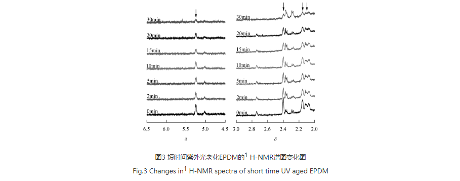 将EPDM 在紫外光下分别老化2,5,10,15,20和30min,对老化后的试样进行1 H-NMR表征,结果见图3。图中可见,随着老化时间的延长,烯氢和碳碳双键α-H的特征峰强度逐渐减弱,说明ENB中烯氢和碳碳双键α-H的含量在老化过程中逐渐减少。