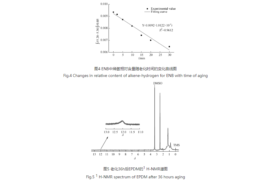 ENB中烯氢的相对含量由δ=5.25的峰面积除以δ=0.85(以含量稳定的甲基为内标)的峰面积得到,以烯氢的相对含量∫δ5.25/∫δ0.85对老化时间t作图并进行线性拟合得到拟合曲线,如图4所示。从图可见,烯氢的相对含量随老化时间的延长而降低,拟合曲线的相关系数R 2=0.9612,可见烯氢的相对含量与老化时间具有较好的线性相关性。将Y=0代入图4中拟合的方程得到t=90.9min,可推算出老化90.9min后烯氢完全反应,从图2(c)可以看到老化2h的1 H-NMR谱图上已经没有烯氢的信号。EPDM中含有0.5%~9.0%的不饱和度,而来自第3单体ENB的不饱和度是形成硫化网络的重要来源[12]。所以生胶在储存和生产使用过程中均需防紫外光。