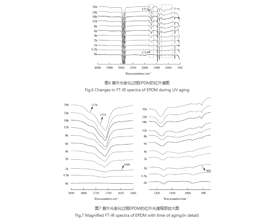 2.以羰基相对亚甲基的吸光度A 1715/A 1464来表征EPDM的老化程度,建立了本实验条件下的紫外光老化方程:P=0.164·t 0.5695(R 2=0.9478)。