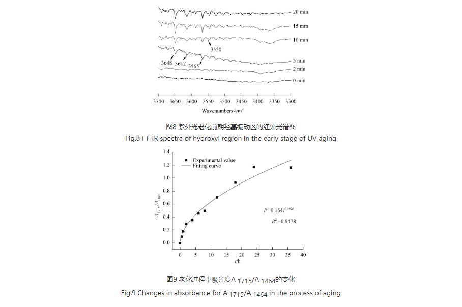 图8为紫外光老化前期羟基振动区的FTIR图,由图可知老化5min后在3648、3612和3565cm-1处出现3个游离的羟基伸缩振动吸收峰,证明羟基老化产物的生成。老化10min后3550cm-1处出现了氢过氧化物中羟基的吸收峰[15],证明老化初期生成了氢过氧化物。