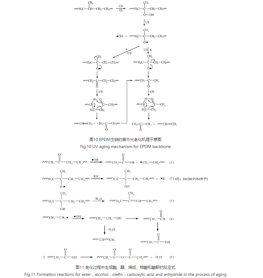 1.EPDM在紫外光老化过程中首先生成氢过氧化物,再进一步老化生成其他含氧产物进而影响整个分子链。随着老化时间的延长,碳碳双键迅速反应,甲基酮含量逐渐增加,分子链先发生交联而后降解,试样变软发粘,老化6h生成烯烃,含量逐渐增加。老化过程还生成了醇、酯和酸酐类产物。EPDDM的抗紫外光老化性能较差,其生胶在储存和生产使用过程中均需防紫外光。
