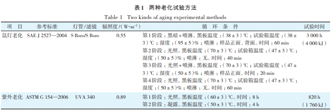 氙灯老化试验采用 SAE J 2527—2004 中的试验方法。紫外老化试验采用了 ASTM G 154—2006 中的试验方法。由于 UVA340 灯管发出的紫外光谱与太阳光谱中的紫外波段(295~365 nm)为近,因此试验选用此灯管。具体内容见表 1。
