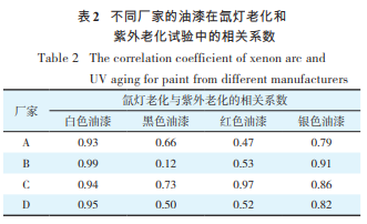 2.1 氙灯老化和紫外老化试验的相关系数不同厂家的油漆在氙灯老化和紫外老化试验中的相关系数见表 2。