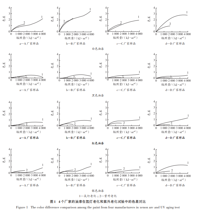 4个厂家的黑色油漆在氙灯老化和紫外老化试验中的色差相近,均小于 0.5。紫外老化试验辐照 1 760 kJ(34 d)后的色差值小于氙灯老化 1 000 kJ(32 d)后的色差值。对于黑色油漆,紫外老化对氙灯老化无加速作用。
