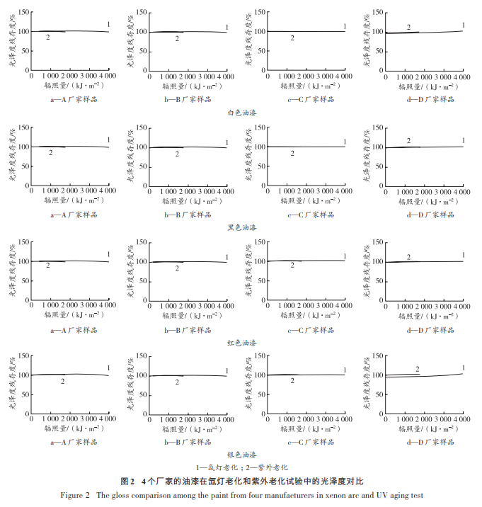 4 个厂家的油漆在氙灯老化和紫外老化试验中的光泽度对比见图 2。由图 2 可见,所有油漆样品在氙灯老化和紫外老化中的光泽度变化率一致,均无较大的变化。紫外老化对氙灯老化无加速效果。