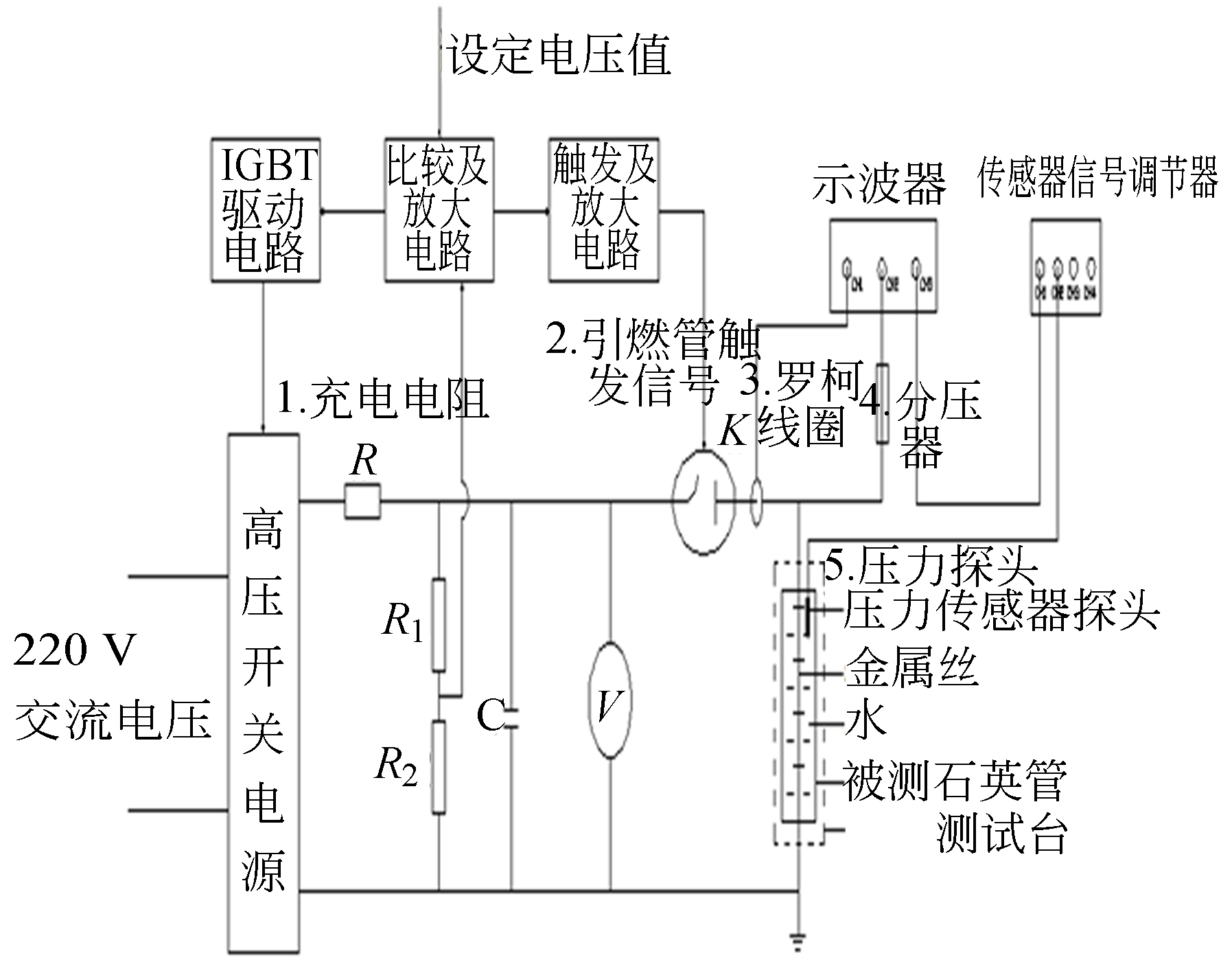 高功率脉冲氙灯放电时,灯内气体产生的径向冲击波超过灯管抗冲击临界值时能导致灯管壁炸裂。模拟氙灯放电运行:脉冲大电流放电会引起金属丝在水中爆炸。当长的金属丝瞬间通以高峰值脉冲电流时会迅速汽化,其蒸汽体积剧烈膨胀产生类似气体放电灯在大功率脉冲驱动下瞬间导通形成放电沟道并立即快速扩大的现象[10-13]。将金属丝置于密闭的石英管中,管内充满水,在高峰值脉冲电流通过时金属丝汽化并产生冲击波,利用水的不可压缩性,此放电冲击波从金属丝位置快速传递至石英管。当放电的电压超过临界值时,灯管抗冲击波性能也超过极限强度,灯管将发生爆裂。通过动态实验,改变放电电压,得出掺铈石英管和复合石英管的抗冲击性能。模拟氙灯放电实验装置图原理如图3所示。