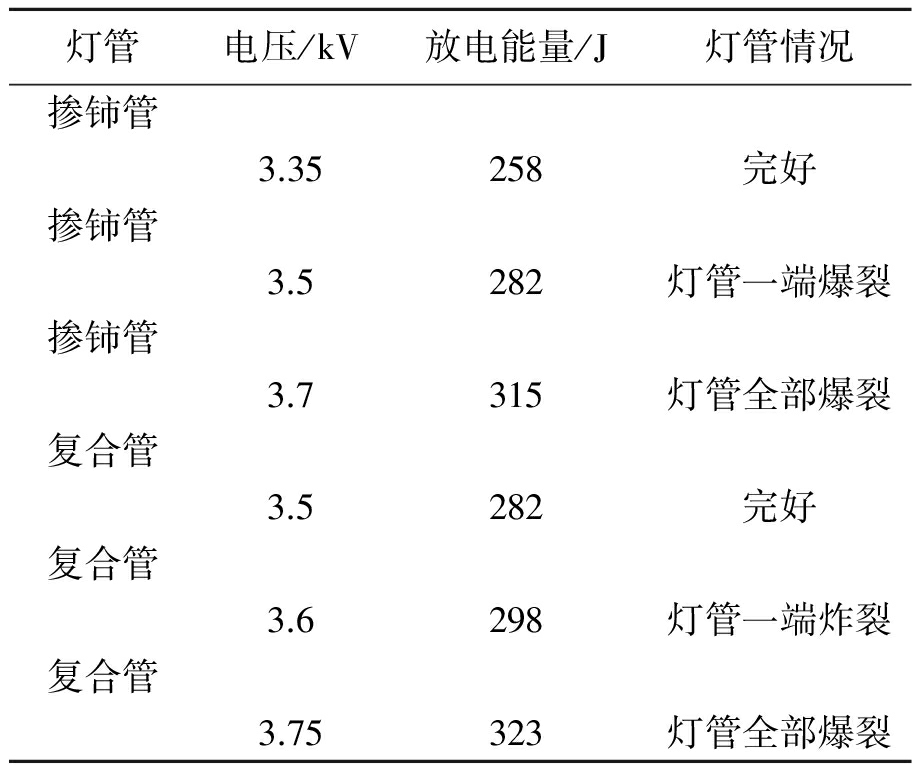 表2中放电能量通过E=1/2 CV2[6]计算所得,其中C为储能电容46 μF,V为放电电压。从表2中可以得出,掺铈石英灯管在放电电压为3.35 kV时,灯管承受的能量为258 J,灯管能承受放电产生的冲击波;复合石英灯管在放电电压为3.5 kV时,灯管承受的能量为282 J,灯管能承受放电产生的冲击波。当电压为3.5 KV时,掺铈石英灯管爆裂,可知掺铈石英灯管爆裂的临界电压约为3.5 KV,承受的能量约为282 J;当电压为3.6 KV时,复合石英灯管爆裂,可知复合石英灯管爆裂的临界电压约为3.6 KV,承受的能量约为298 J。通过比较,复合石英灯管抗冲击性能优于掺铈石英灯管。