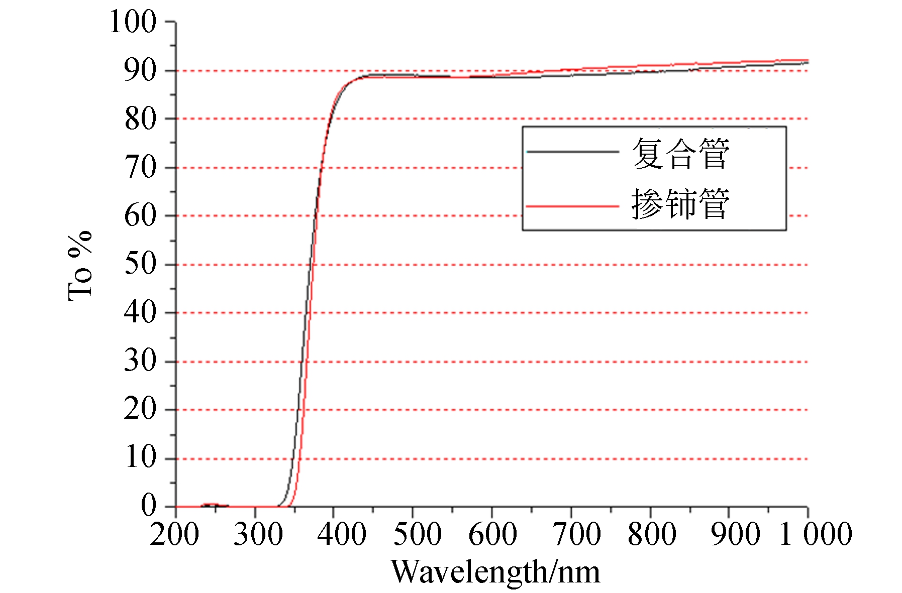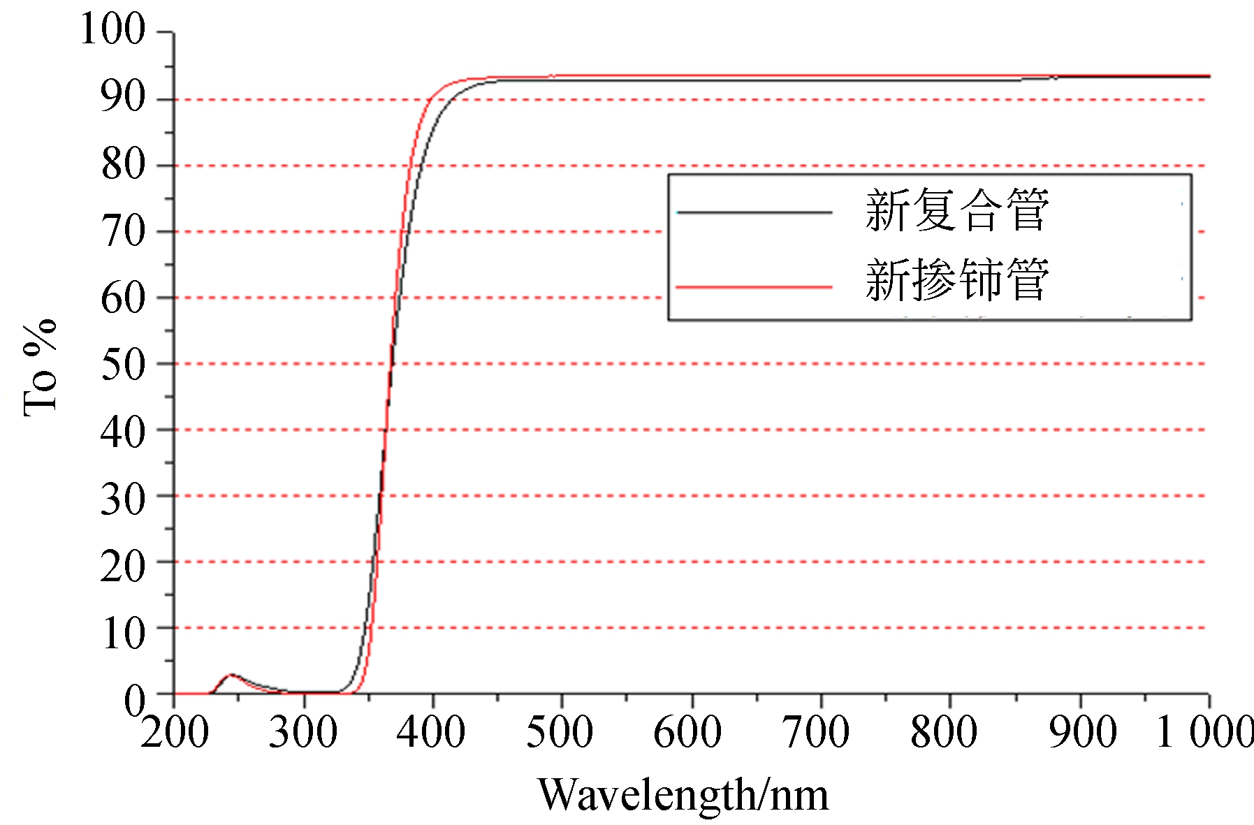 本文分别选取了新的复合石英灯管样片和掺铈石英灯管样片(厚度均为2.5 mm),采用PerkinElmer Lambda 900 UV Spectrometer 光谱仪进行200~1 000 nm的透过率测试。得到光谱透过率曲线如图1所示。