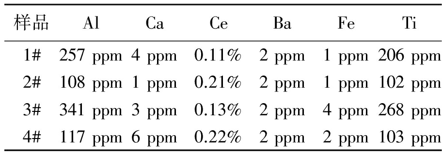 使用电感耦合等离子体——发射光谱测试(ICP ) 对新复合石英灯管1#、新掺铈石英灯管2#、14000发次复合石英灯管3#、14000发次掺铈石英灯管4#,进行元素分析,得到Al、Ca、Ce、Ba、Fe、Ti在1#、2#、3#、4#样品中的含量。