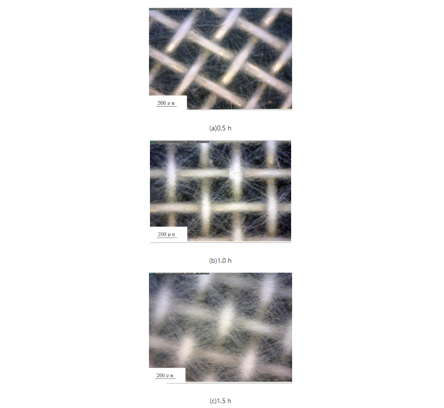 从高倍显微镜下拍摄的聚乳酸薄膜形成过程的图片可知,在开始阶段,网状电极上孔隙部分纤维较少,纤维主要沉积在网丝上,导致聚乳酸薄膜克重分布不均匀,即网丝上纤维克重大,呈现一种囊状结构,孔隙部分克重小呈现一种迷宫式网状结构。出现这种结构不均匀的主要原因是不锈钢网丝导电性较好,局部场强较强,而孔隙部分导电性较弱。之后,随着纺丝时间的增加,不锈钢滤网上纳米膜的厚度逐渐增加,接收表面的导电性差异愈加不明显,导致纳米膜结构的不均匀性逐渐不明显。