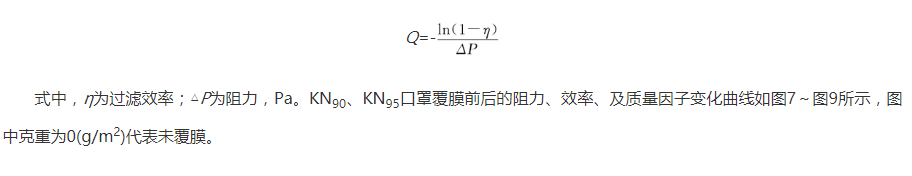 对市场上所购买的KN90、KN95两种口罩覆上不同纺丝时间下的纳米膜;并用TSI8130测试覆有纳米膜口罩与未覆有纳米膜口罩的的效率与阻力,并计算其品质因数。品质因数Q定义为