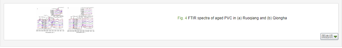图 4是PVC在若羌和琼海自然老化不同时间的红外光谱图.从图中可以看出,PVC老化后在1445 ~ 1485 cm-1(―CH2―的C―H弯曲振动峰)、1600 ~ 1700 cm-1(C=C伸缩振动峰)、1700 ~ 1800 cm?1(C=O伸缩振动峰)、3200 ~ 3550 cm-1(―OH伸缩振动峰)波数附近的吸收峰变化明显.其中―OH、C=C和C=O吸收峰强度在老化后增加,―CH2―吸收峰强度老化后减少,但若羌和琼海的PVC样品分子结构变化程度不一样.也就是说PVC在若羌和琼海自然老化后都发生了脱除HCl反应、生成了C=C,CH2减少,并且在氧气、紫外光等作用下发生了氧化反应生成C=O、―OH含氧官能团,但是反应的程度不同,这使得其外观颜色变化产生明显区别.