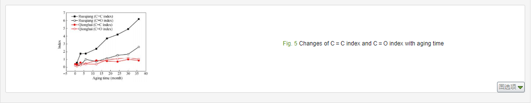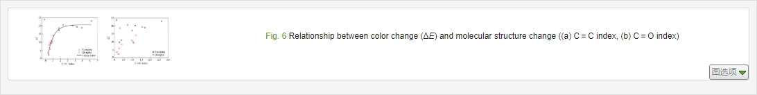 分别以C=C指数、C=O指数为横坐标,ΔE值为纵坐标作图,分析颜色变化与分子结构变化之间的联系,结果如图 6所示.从图中可以看出, 随着C=C指数的增加,ΔE值先迅速增加,后趋于平衡,二者的相关性可用指数函数关系式y = aebx + y0进行表达,图中的拟合曲线与试验值误差较小;随着C=O指数的增加,ΔE值同样逐渐增加,但二者之间函数关系不明确.这说明颜色变化与C=C指数相关性较好,与C=O指数相关性较差,即颜色变化与C=C变化之间存在密切联系.