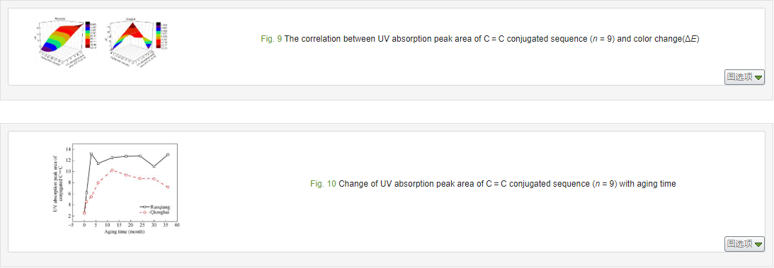 以n = 9的共轭序列为例,进一步分析长共轭序列与颜色变化的相关性,分析结果如图 9所示.从图中可以看出随着老化时间增加,n = 9的长共轭序列峰面积与色差值ΔE的变化趋势相同,即n = 9的长共轭序列增加,色差值ΔE几乎呈线性增加. 图 10是PVC在若羌和琼海地区老化后n = 9的长共轭序列紫外吸收峰面积随老化时间变化图, 可以看出,随着老化时间增加,n = 9的共轭序列增加,并且在若羌老化的PVC样品的n = 9的共轭序列比在琼海老化的样品增加的快,这表明PVC在辐射高的若羌老化后更容易生成长共轭序列的C=C.也就是说,PVC在辐射高的若羌地区更易发生氯化氢脱除反应,生成长共轭C=C序列,从而使样品更易变色,可证明辐射是影响PVC老化变色行为和分子结构变化主要的环境因素.