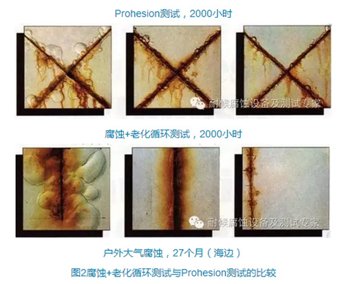 图1给出了Prohesion测试和连续中性盐雾试验与户外大气腐蚀之间的相关性比较,结果表明Prohesion测试与户外大气腐蚀之间的相关性较好。下面的图2将比较腐蚀+老化循环测试与Prohesion测试的结果[4]。从图2中明显看出,腐蚀+老化循环测试与户外大气腐蚀的相关性比Prohesion测试与户外大气腐蚀的相关性好。