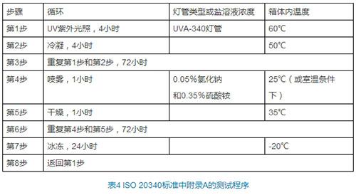 还有的试验方法,除了Prohesion测试和紫外曝晒之外,还有冰冻循环,三者交替进行,如ISO20340标准中附录A的测试程序A[7]。具体的试验条件如表4所示:
