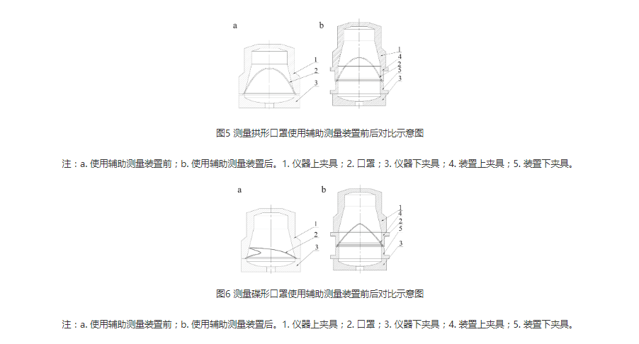 辅助测量装置的使用原理是在测试开始前将口罩放置在装置的上下夹具之间,将放置好口罩的装置安放在测试仪的下夹具上,开始测试。