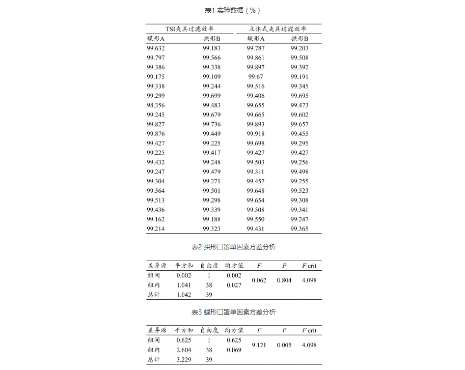 TSI8130型自动滤料测试仪选用的气溶胶类型为氯化钠,粒数中值直径(0.075±0.020)μm,几何标准差不超过1.86,浓度不超过200 mg/m3,气流通过的截面积100 cm2[9]。拱形口罩为河南亚都实业有限公司生产,蝶形口罩为江西3 L医用制品集团股份有限公司生产。