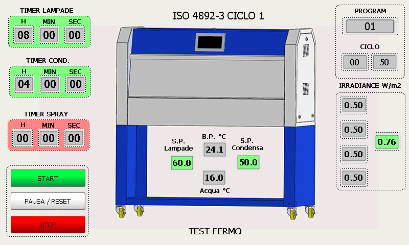 为了模拟由外部大气因素引起的老化,CO.FO.ME.GRA 紫外老化实验箱使材料在受控高温下经受紫外线辐射和湿度的交替循环。该仪器通过使用特殊的UV荧光灯模拟日光的影响,通过凝结或喷水来模拟露水和雨水的影响(喷雾选项)。